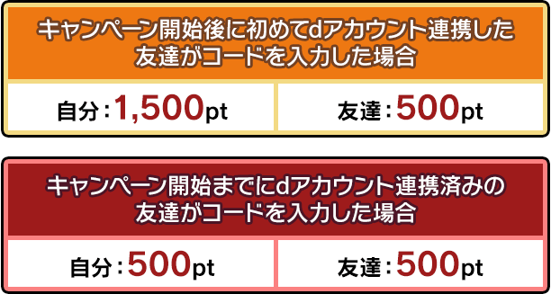 自分の友達キャンペーンコードを友達に入力してもらい、友達がお題を達成すると、自分と友達の両方にdポイント(期間・用途限定)をプレゼント!